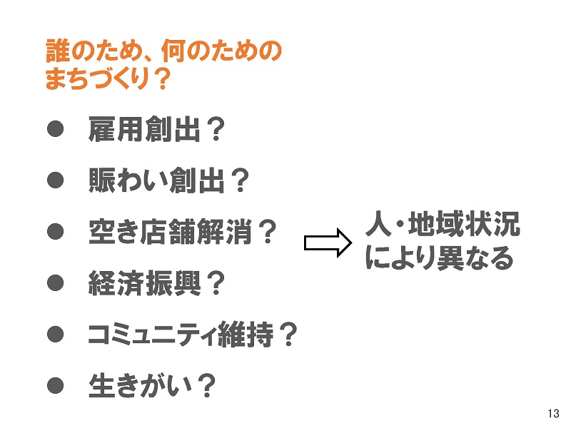 - まちづくりというのは目標がすごく大事で、それがないと行き先がなく大海原をさまようようなことになってしまうので、我々なりに仮説を立てました。ただし、私はまちづくりにおいて、必ずしもみんなで共有する必要はないと思っています。