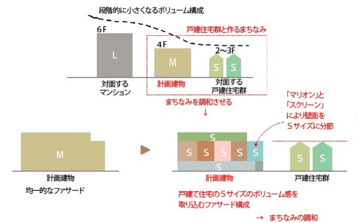 1.壁面の分節・・・・・対面する戸建住宅群のまちなみと調和
