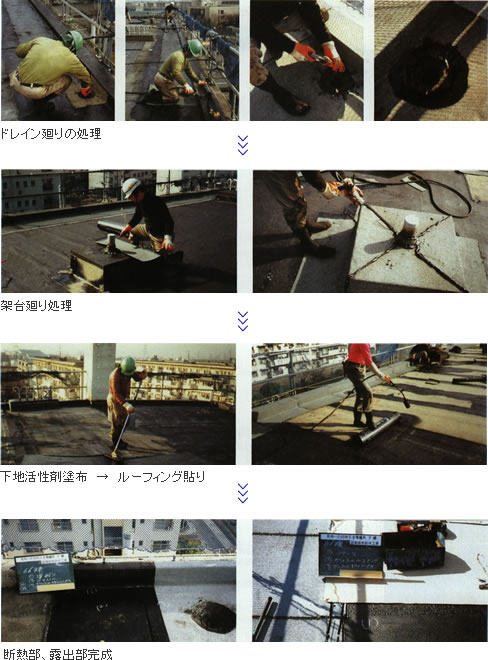 アスファルトの溶融釜を必要としないため、煤煙や臭気発生の問題が少なく、環境にやさしい防水工法。トーチ工法、複合工法、自着工法の3工法があります。
