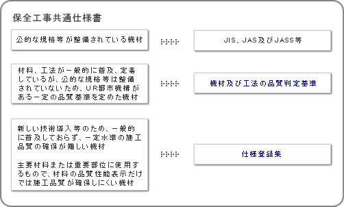 UR都市機構の保全工事共通仕様書は、施工仕様の標準化、部品及び機器(以下機材という)の規格仕様の統一化を図り、施工品質の確保並びに設計及び工事監理業務の効率化を図るために、昭和59年度を初年度として定められています。