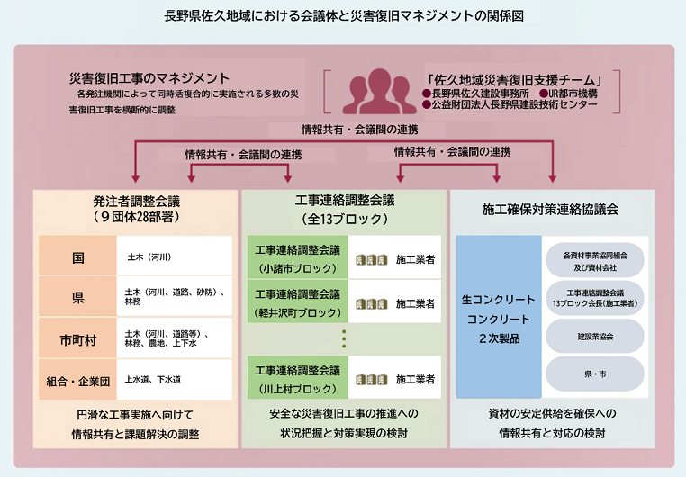 - 発注者間で地域全体の情報共有を図る「発注者間調整会議」や、ブロック毎の個別課題を調整する「工事連絡調整会議」を設置し、運営を支援