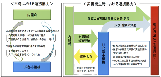 URは令和2年6月に内閣府と「災害時の住家の被害認定業務支援に関する協定」を締結し、市町村が実施する住家の被害認定業務について、内閣府が実施する被災自治体支援の協力をしています。