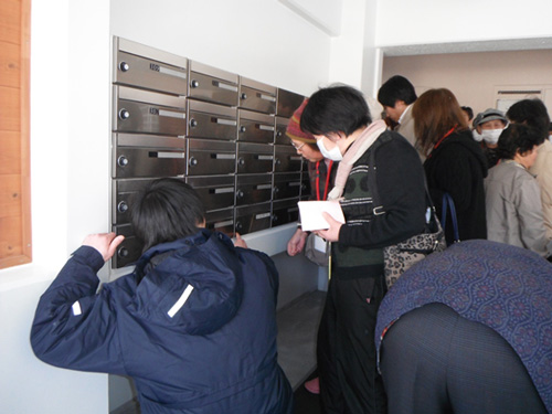次に、住戸の内覧です。共同花壇、集合ポスト、エレベーターといった共用部の説明の後、入居される住宅と同じタイプ(2DK、3DK)の住戸を見学していただきました。 集合ポストには、自らお名前を書いたネーム用紙を、それぞれのポストに取り付けてもらいました。