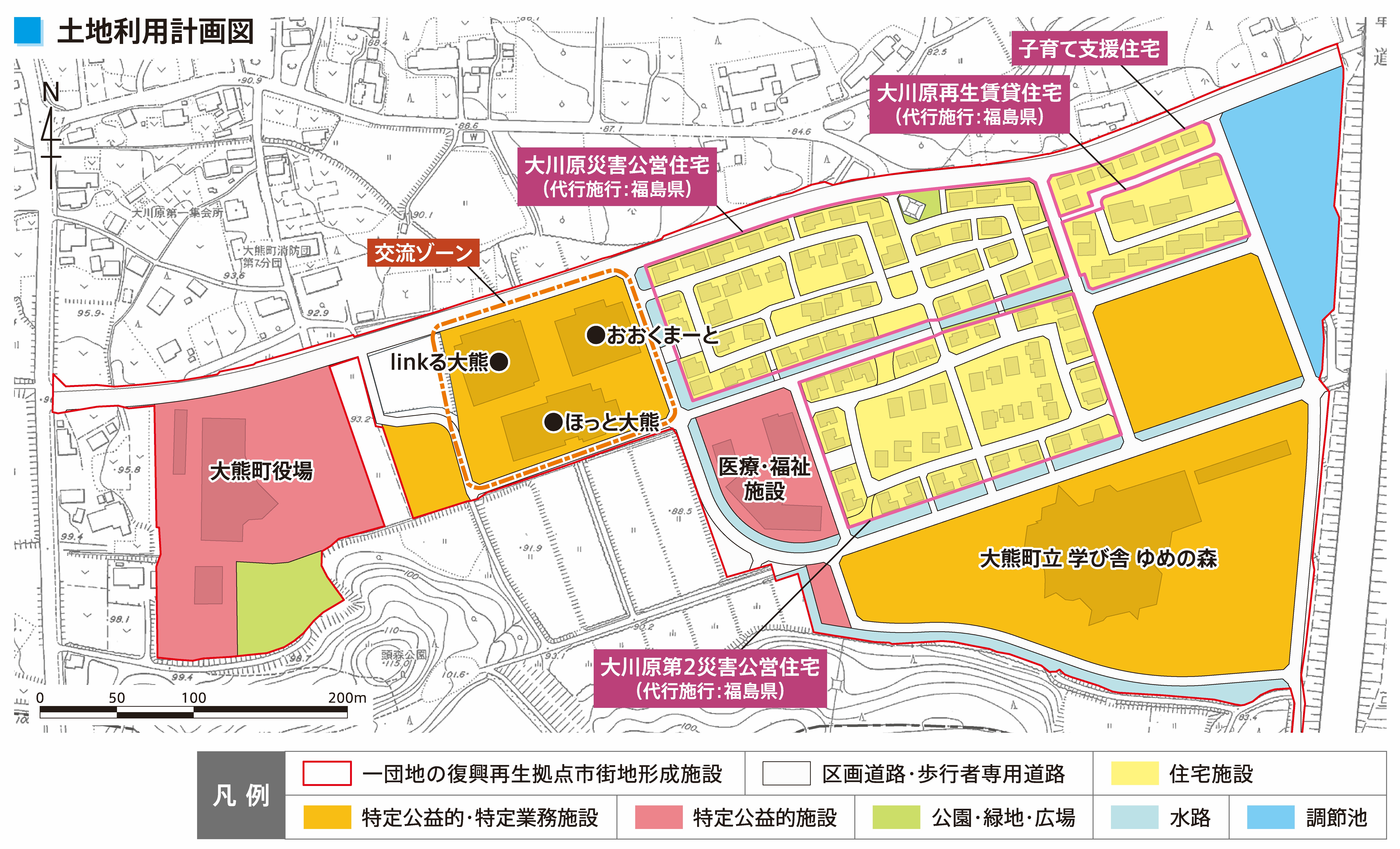 令和元年5月の大熊町役場新庁舎での業務再開に続き、公営住宅や医療・福祉関連施設、商業施設(「おおくまーと」)、教育施設(「学び舎 ゆめの森」)等が立地し、町土復興をけん引する拠点としての役割が期待されています。