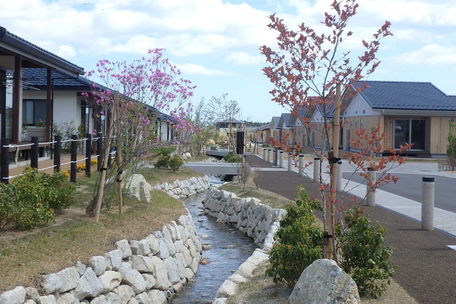 最初の復興拠点「大川原地区」における災害公営住宅の様子、修景にも配慮して改修した農用水路が地区内を横断している