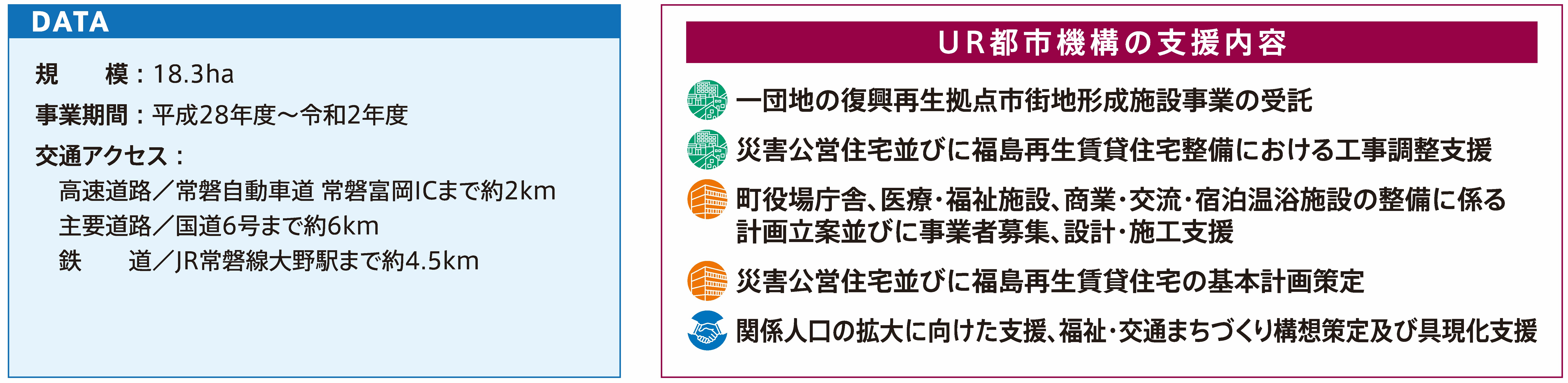 UR都市機構は基盤整備のほか、役場新庁舎や商業施設等の計画立案や設計・施工の支援を行いました。