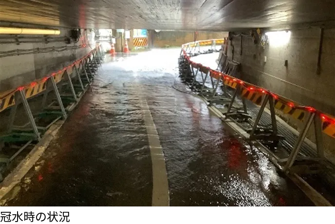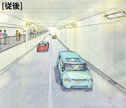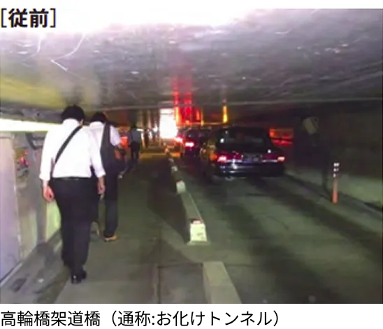 品川駅北周辺地区は、従前は広大な車両基地が広がっており、この周辺で街を東西に行き来できるのは背中を丸めてやっと通れる通称“お化けトンネル”だけでした。お化けトンネルは近隣住民の方々の重要な生活動線となっていましたが、線路下を通っていることから大雨があると度々冠水する状況でした。そこで、UR都市機構は幹線下水道の再整備により周辺の冠水リスクを解消するとともに、段階的なルートの切換えを行い常に歩行者動線を確保しながら、より快適な道路を鉄道直下で整備しています。