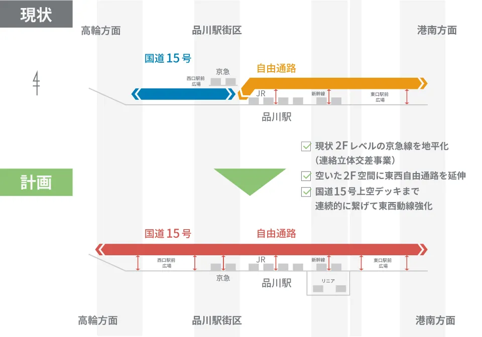 品川駅周辺では、連続立体交差事業により、鉄道によって阻害されていた地域の一体化が図られ、新たな魅力あるまちづくりが推進されていきます。 UR都市機構は、既存の品川駅中央自由通路の延伸及び北側自由通路の整備を実施することにより、国道15号上空デッキと繋がるデッキレベルの歩行者ネットワークを構築するとともに、駅乗降客等による混雑解消を図り、利便性の高い国際交流拠点・品川の形成を推進しています。