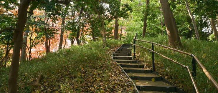 品川駅西口地区内の高輪森の公園は、起伏に富んだ地形に貴重な自然が残されており、地域の子供たちのためのプレーパーク事業が行われています。周辺の建物開発と合わせた拡充整備により、視認性・アクセス性・防災性の向上を図るとともに、関連事業者との連携により、周辺緑地等との一体的・連続的な空間形成や管理運営を図ります。
