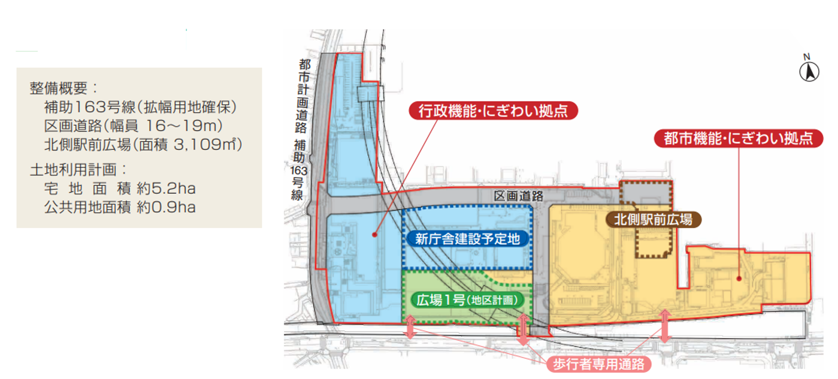 - 周辺市街地と地区をつなぐ区画道路や駅前広場、歩行者専用通路の整備により、歩行者や車両交通のネットワ ークの形成を図るとともに、地域をつなぐ核として、平時は憩いの場、災害時は行政機能等と連携した防災拠点となる広場空間を確保します。