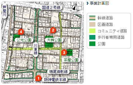 芦屋中央地区においては、「快適で人にやさしいまちづくり」「魅力あふれるまちづくり」「災害に強いまちづくり」の3点を目標として、芦屋の中心核にふさわしいまちづくり進めています。
