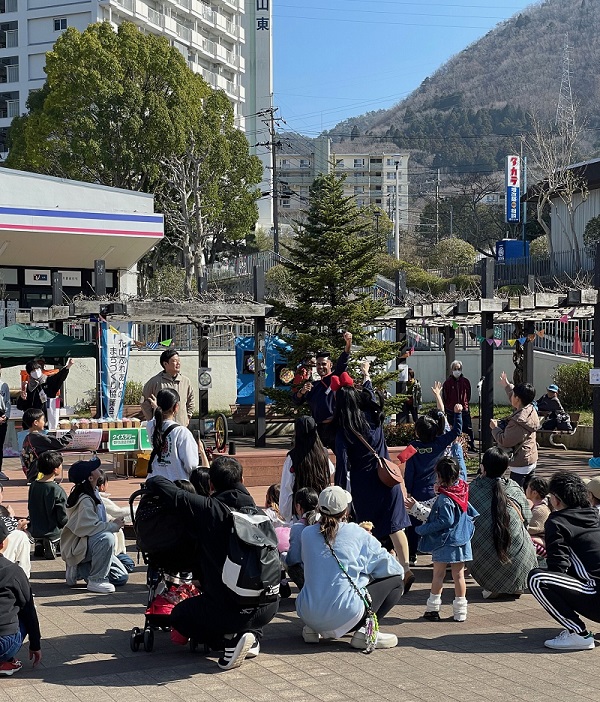 3月22日(土)、花山東団地(神戸市北区)で「HANAYAMAパーティー in はなやま合衆国」を開催しました。これは神戸市とURによる「包括連携協定」に基づき、神戸市のALT(外国語指導助手)が団地に多数お住まいである特性を生かした、多文化・多世代交流を目的としたイベントです。約400人が来場し、地域の皆さまで作成したガーランドが飾られた会場で、ALTの乾杯を合図にパーティーがスタート。ステージでの多彩なパフォーマンスに加え、ALTとの会話やゲームのコーナー、コーヒーやドーナツの販売も行われ、URによる缶バッチ作成ブースも行列が絶えませんでした。また、集会所では、兵庫県立人と自然の博物館の展示があり、こども達はヘラクレスオオカブトなどを手に取って観察しました。