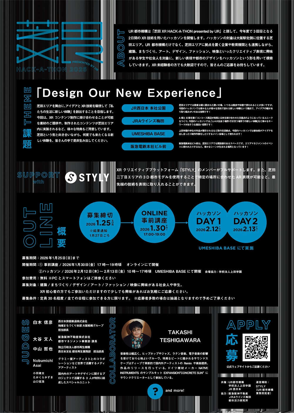 URは「芝田 XR HACK-A-THON 2026 presented by UR 」と題して、今年度で3回目となる2日間のXR技術を用いたハッカソンを開催します。今年度のテーマは、「Design Our New Experience」になります。