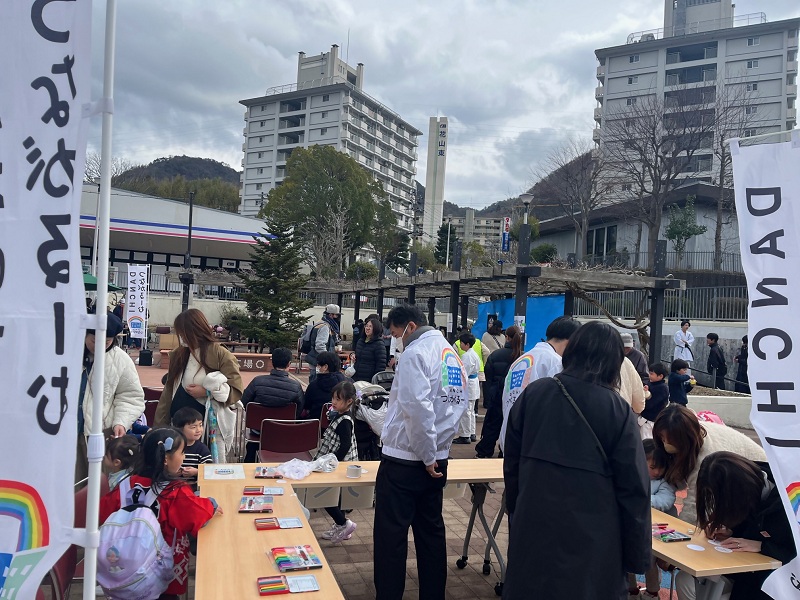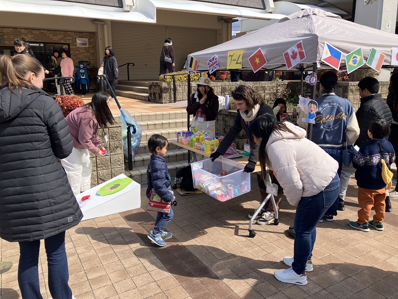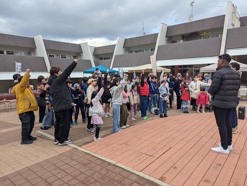 イベントでは、ALTや、地域の方、大学生サークルによるゲーム、飲食ブース、ブラスバンド演奏、幼稚園児や空手教室の演目、歌のステージに加え、当日同時開催の花山駅前マルシェをめぐるクイズラリーもあり、団地と駅前が多文化にふれながら笑顔あふれる一日となりました。