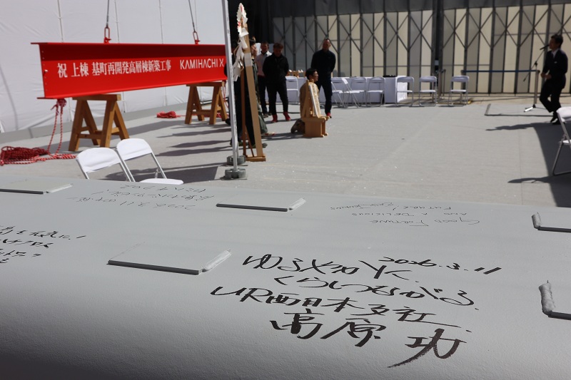 当日は約150人が参加し、建物の棟上げを祝いました。鉄骨の柱に未来へのメッセージを記す寄せ書きも行われ、事業関係者、地元のエリアマネジメント団体や学生によって、完成への期待や広島への想いが込められました。