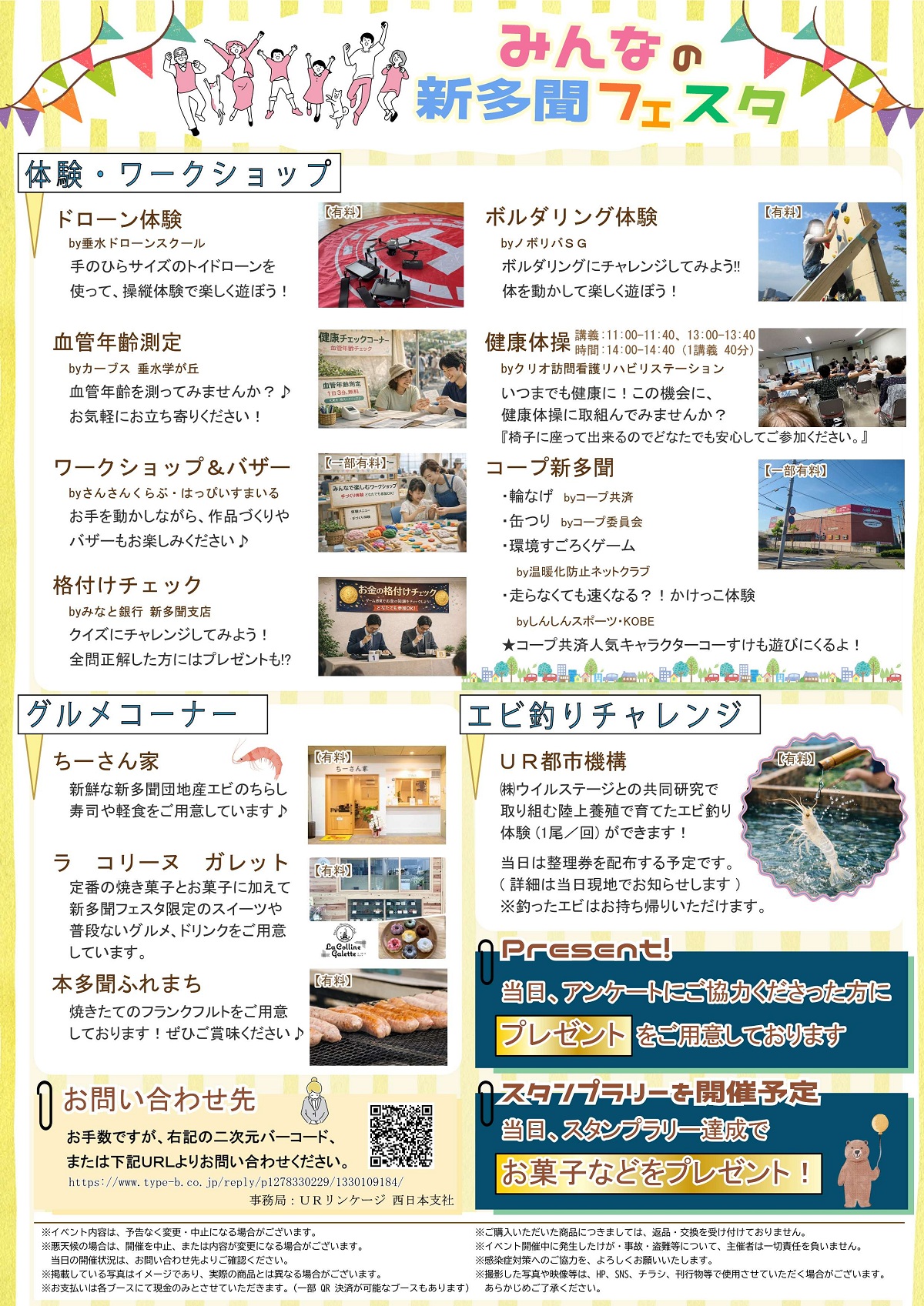 子どもから大人までが楽しめる内容となっており、ドローンやボルダリングの体験、血管年齢測定や健康体操、ワークショップやバザー、エビのちらし寿司や焼き菓子の販売など、新多聞センター街をはじめ地域について皆さまに知っていただけるイベントです。